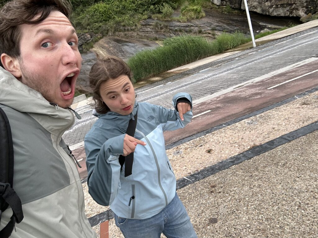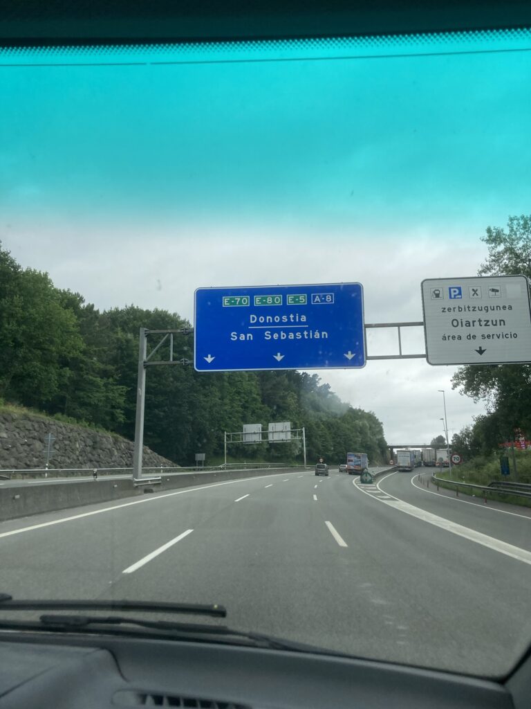 Wir haben den Regen gekonnt überstanden und uns von San Sebastian mental schon verabschiedet, als uns an der Strassenkreuzung Stadt auswärts erklärt wurde wir müssten jetzt 2h Pause machen weil die Strasse gesperrt sei… ehm… well… zuerst verwirrt, folgten wir brav und fanden kurz darauf raus wieso:
